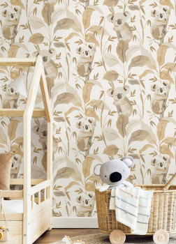 Eine niedliche Vliestapete für Kinderzimmer mit Koala-Bären und Pflanzen in Beige-, Braun-, Grau- und Goldtönen auf grau-weißem Hintergrund.