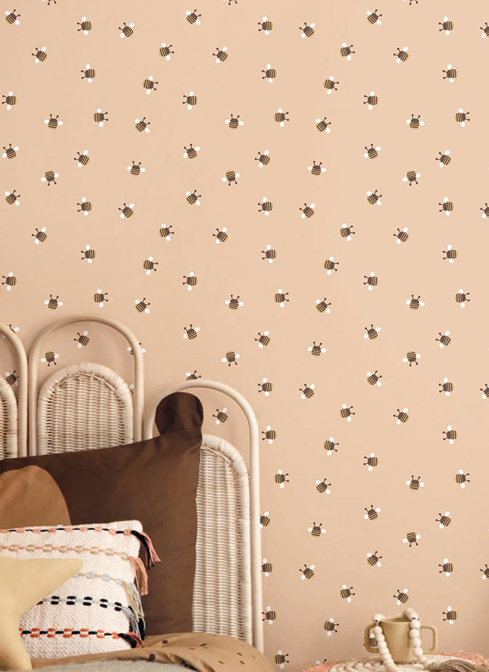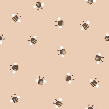 Niedliche Vliestapete für Kinderzimmer, mit Bienen auf rosa Hintergrund, die Bienen sind in Braun, Gold und Weiß gehalten.
