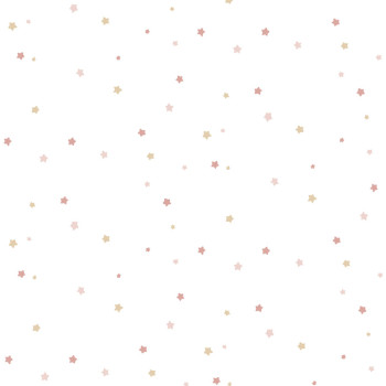 Glatte Vliestapete, weißer Hintergrund, Sternchen in Gold und Rosatönen, Größe 0,5 und 1 cm.