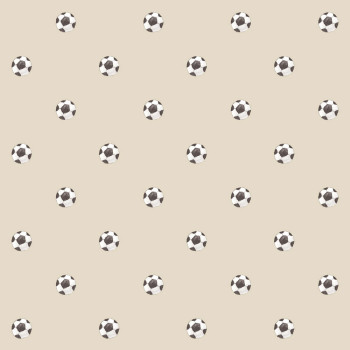 Verspielte Vliestapete für Kinderzimmer, mit Fußballmotiven, beigem Hintergrund und Bällen in Schwarz, Weiß und Grau.