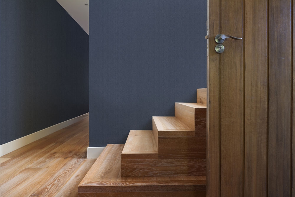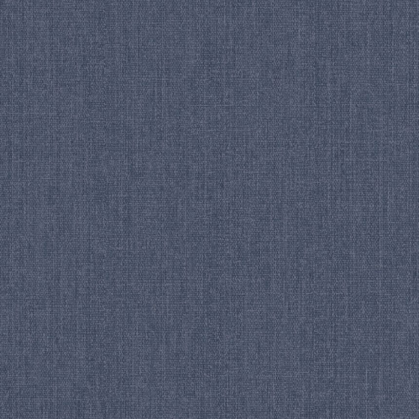Vinyltapete. Imitation von grobem Stoff in Blautönen, glänzender metallischer Hintergrund.