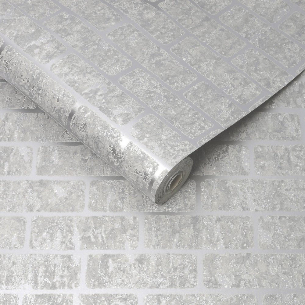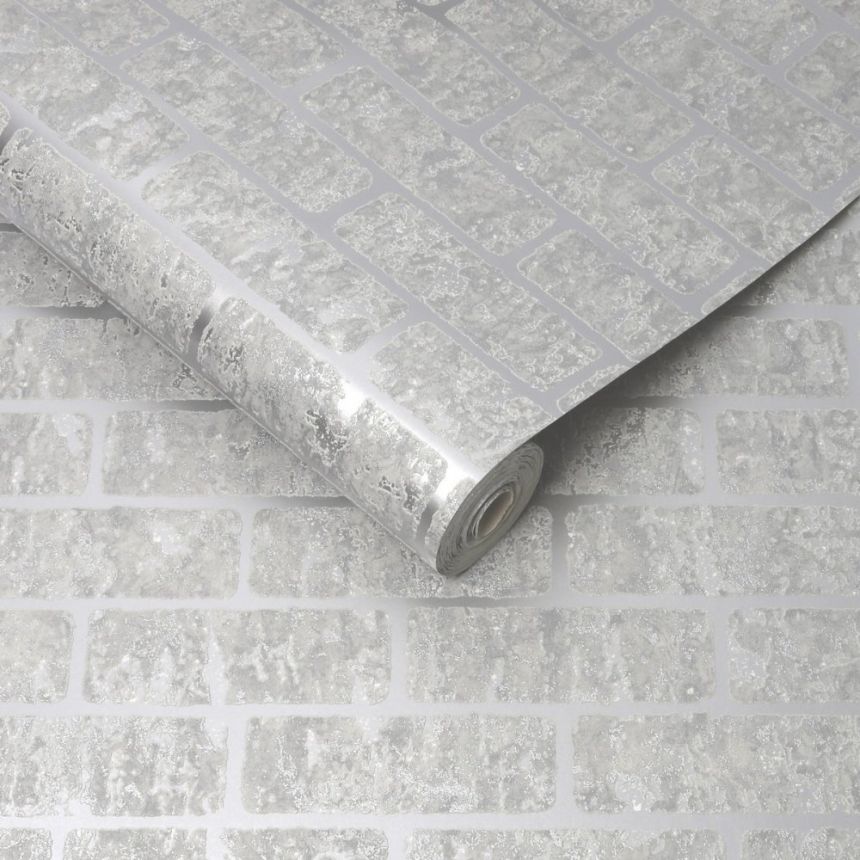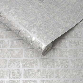 Vinyltapete. Stark plastische Struktur in Grau- und Silbertönen. Die Gelenke sind glatt, silbern.