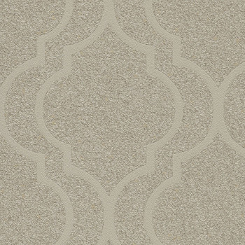 Luxuriöse Vliestapete in Beigetönen mit einem Muster aus kleinen Steinen und sanftem Glanz und einem markanten cremigen Perlenmuster im Art Deco Stil. Moderne Tapeten fürs Wohnzimmer.