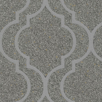 Luxuriöse Vliestapete in Schwarz- und Silbertönen mit einem Muster aus Steinen und sanftem Glanz und markanten Silberstreifen. Moderne Tapeten fürs Wohnzimmer.