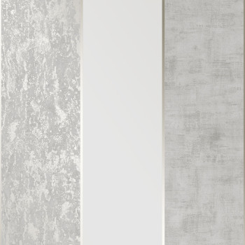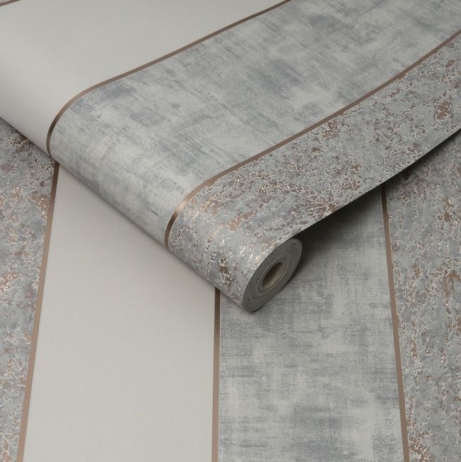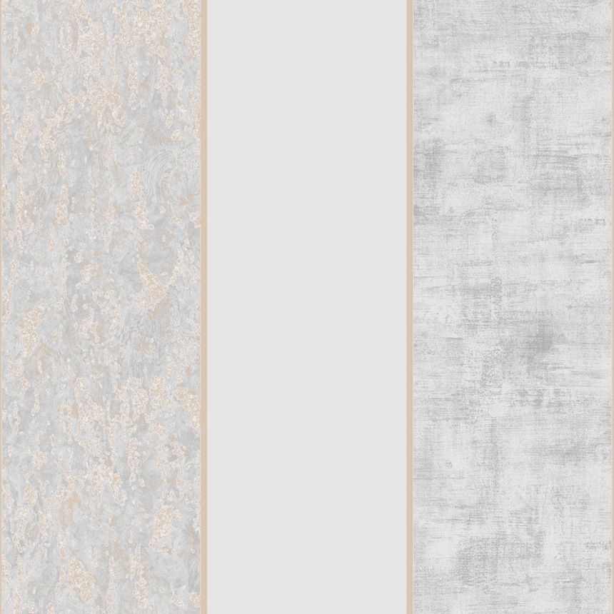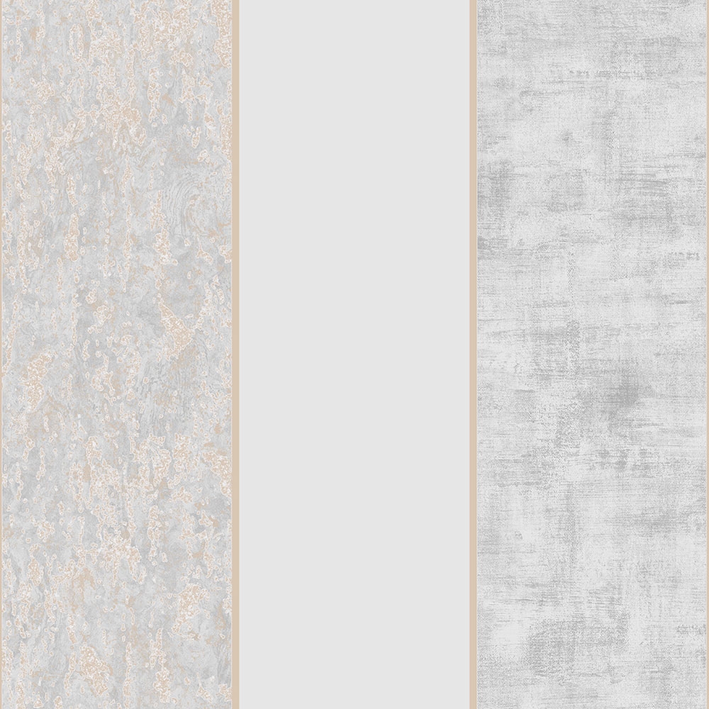 Vinyltapete. Wechsel von plastischen, gestromten und einfarbig glatten matten Oberflächen und Prägungen in Grau- und Roségold-Tönen.