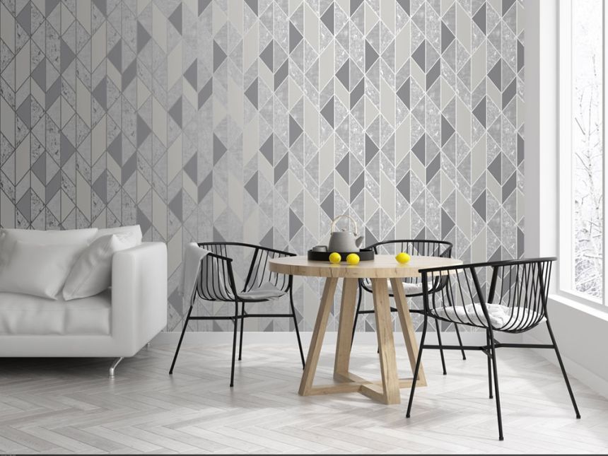 Vinyltapete. Wechsel von plastischen,glatten matten Oberflächen und Vertiefungen in Grau- und Silbertönen. Die Konturen sind glatt, silbern.