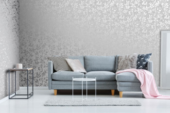 Vinyltapete. Stark plastische Korkstruktur in Grau- und Silbertönen. Der Zweig ist glatt, silbern.