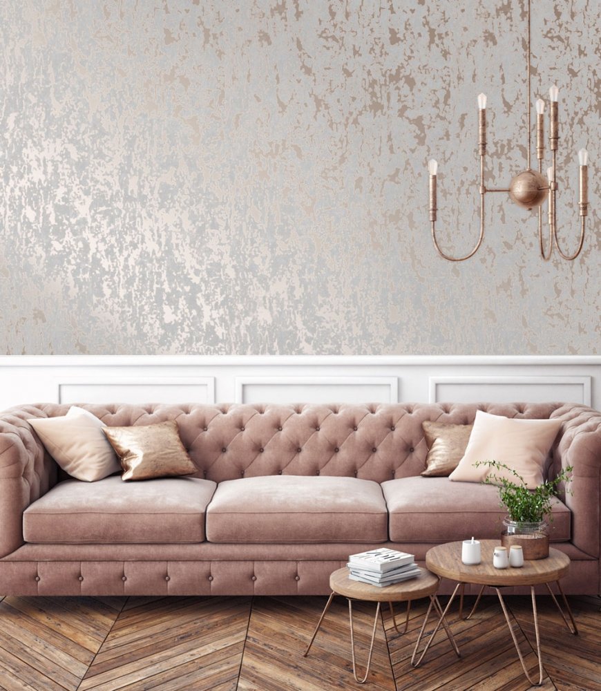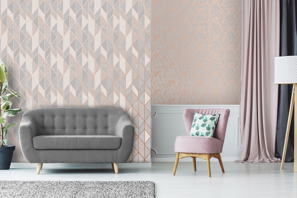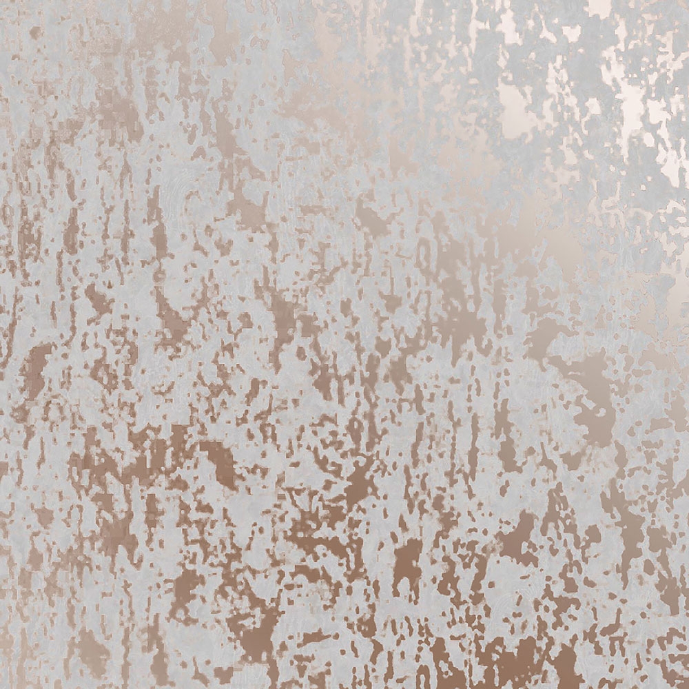 Vinyltapete. Stark plastische Korkstruktur in Grautönen, durchscheinender, glatter Hintergrund in Roségoldfarbe.