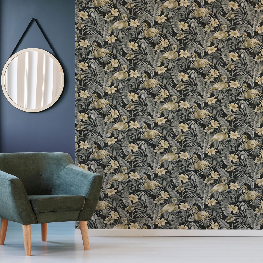 Non-woven wallpaper Flowers, leaves, flamingos 106740, Sandrine Tropics, Paradise, Graham & Brown