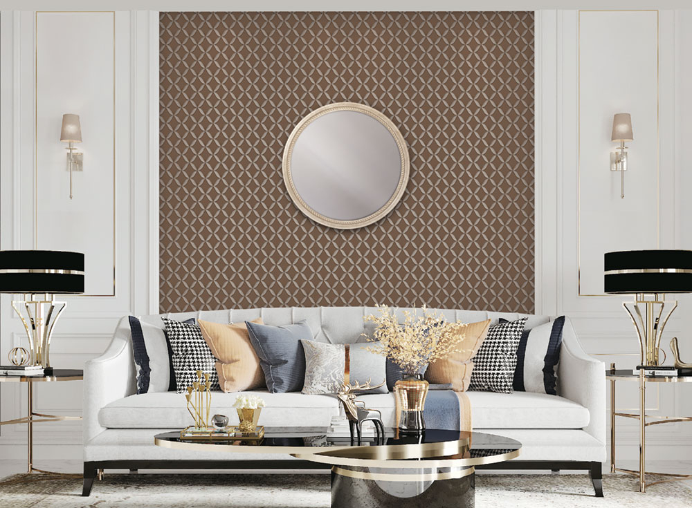 Luxus-Vliestapete. Die Tapete ist braun mit silbernem Muster, metallischen Goldkonturen.