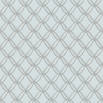 Luxus-Vliestapete. Die Tapete ist grau-blau mit einem grau-silbernen Muster.