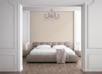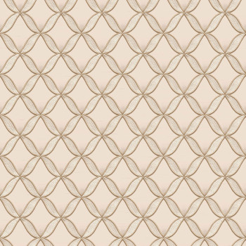 Luxuriöse Vliestapete in Beige mit silbernem Muster, goldenen Konturen und Stoffstruktur.