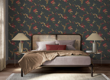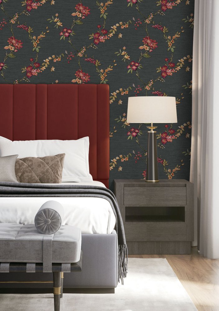 Luxuriöse Vliestapete mit schwarzem Hintergrund und metallischen burgunderfarbenen Blumen.