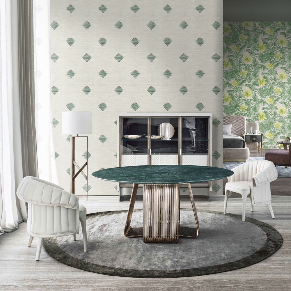 Tapeten mit klassischen Barockmotiven, ergänzt durch Streifentapeten, aber auch moderne Damastmuster und Tapeten, die Stuck imitieren oder mit zarten Blattmustern versehen sind, bringen Eleganz in Ihr Zuhause.