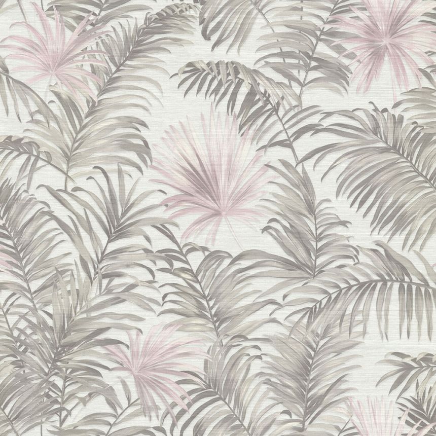 Vliestapete für die Wand. Weiß-grauer Hintergrund, Muster rosa, grau-braun.