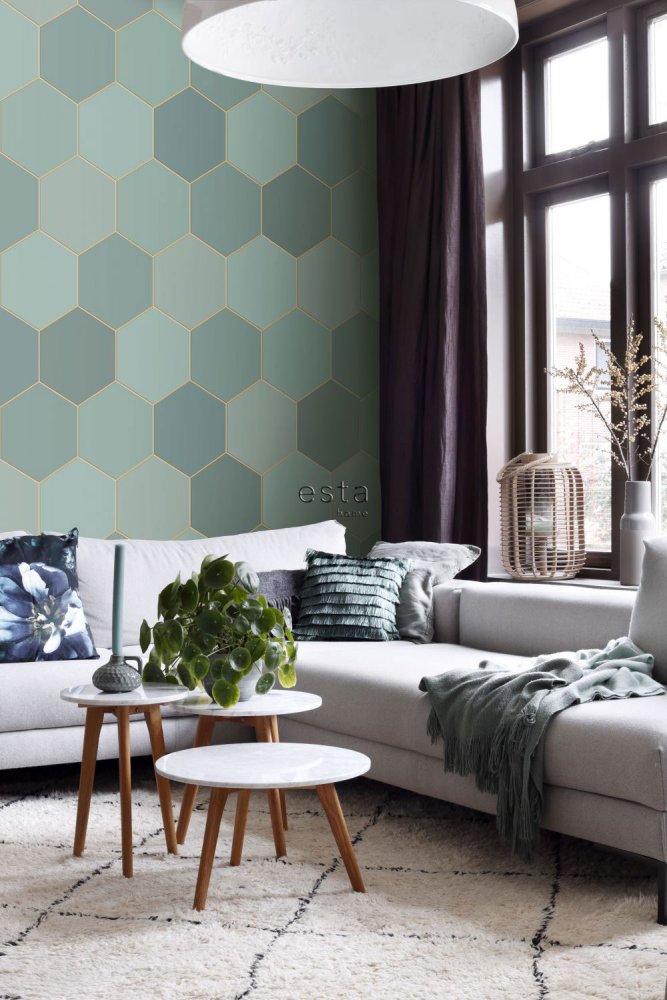 Fototapete mit geometrischem Muster in Grüntönen. 3 Tapetenpaneele. Die Tapete hat ein durchgehendes Muster, für eine größere Breite einfach ein weiteres Stück kaufen.