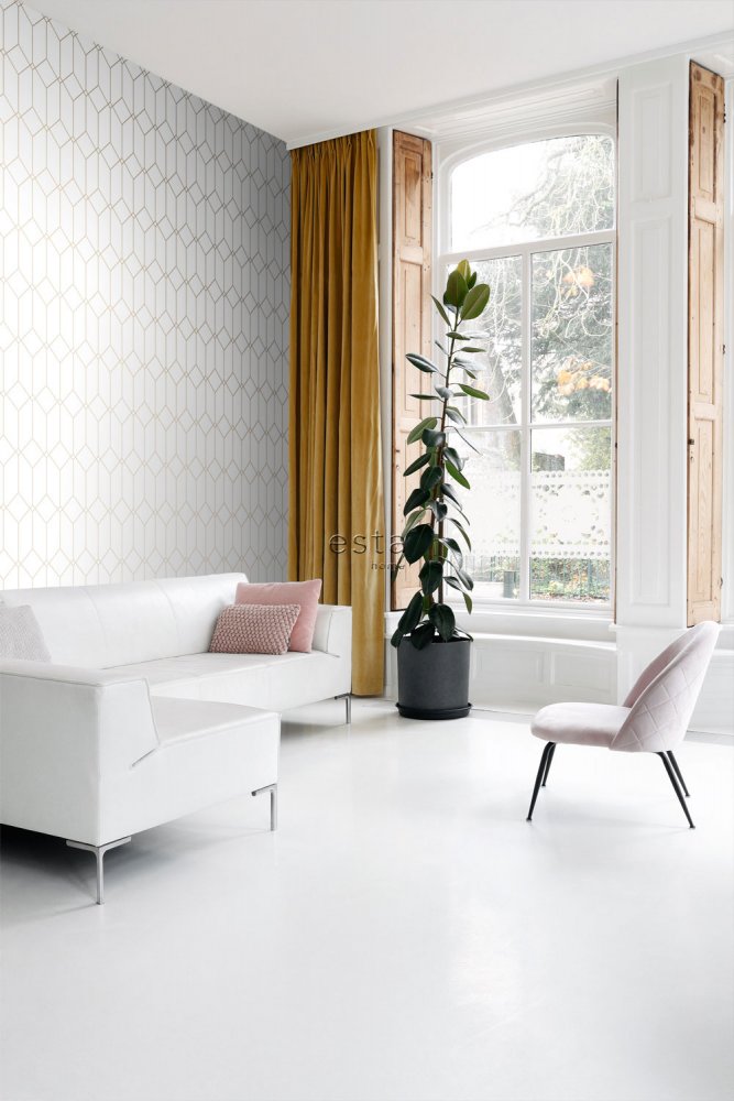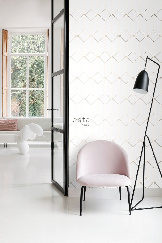 Weiße geometrische Vliestapete für die Wand, goldene Linien 139223, Art Deco, Esta