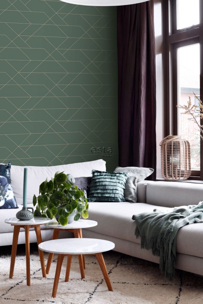 Vliestapete für die Wand grün mit goldenen Linien.