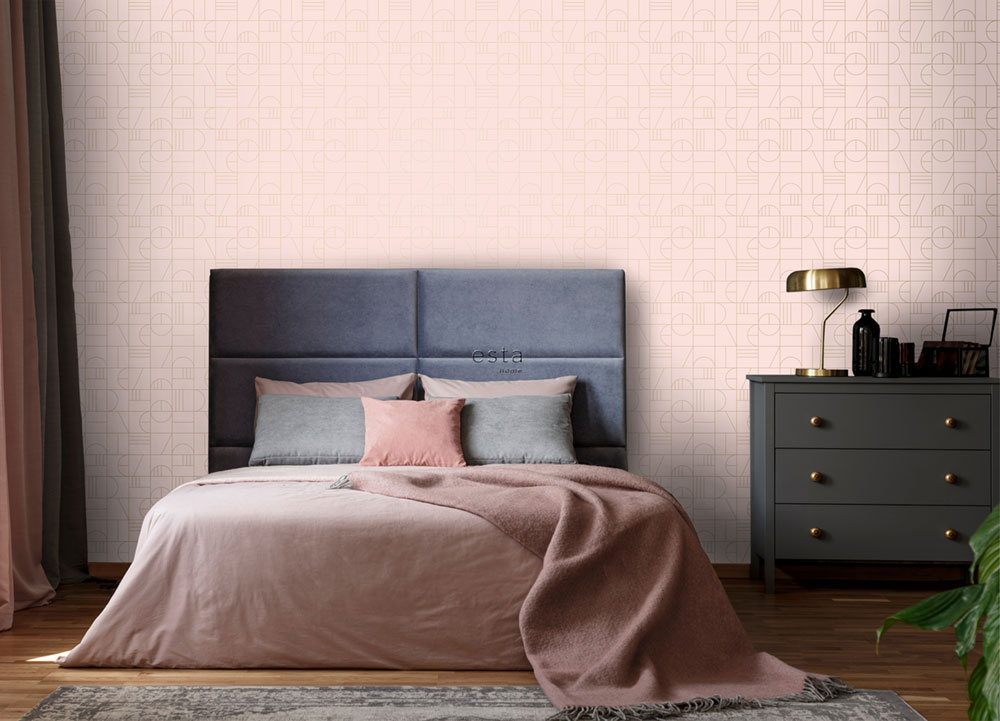 Vliestapete für die Wand, rosa mit goldenen Linien.