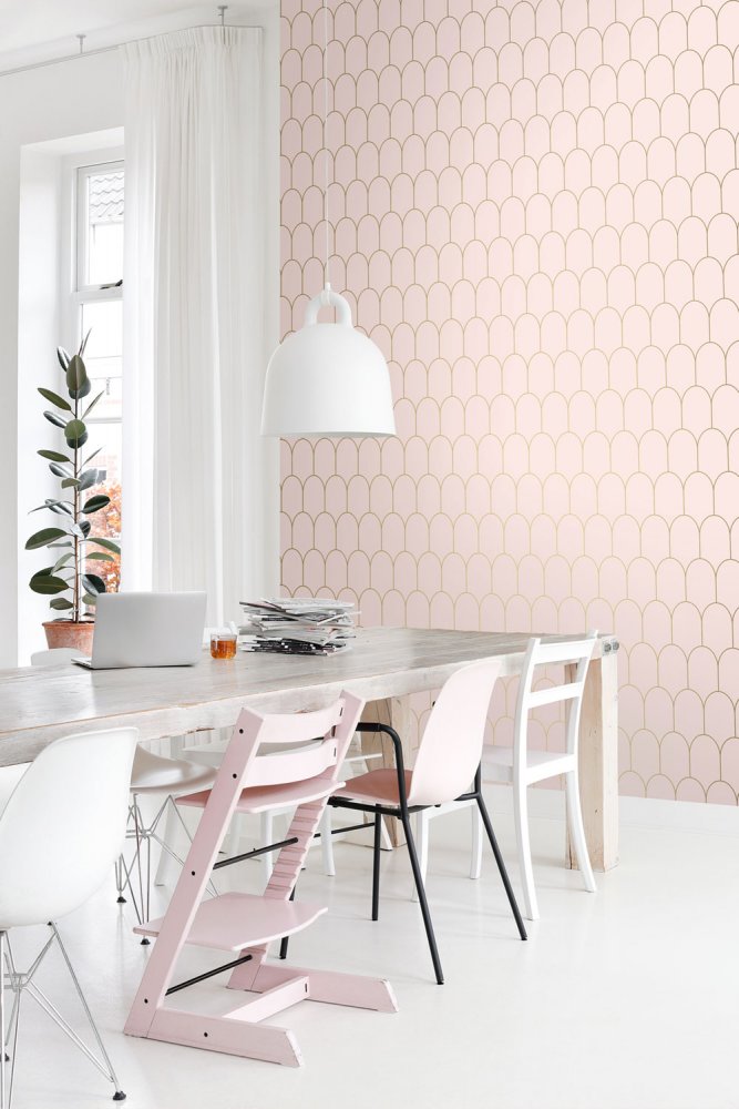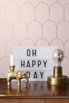Vliestapete für die Wand, rosa mit goldenen Linien.