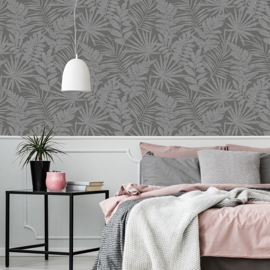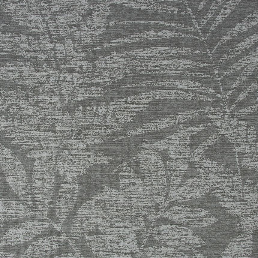 Vliestapete mit Stoffstruktur, Blatt-Dessin grau-schwarz Melange.