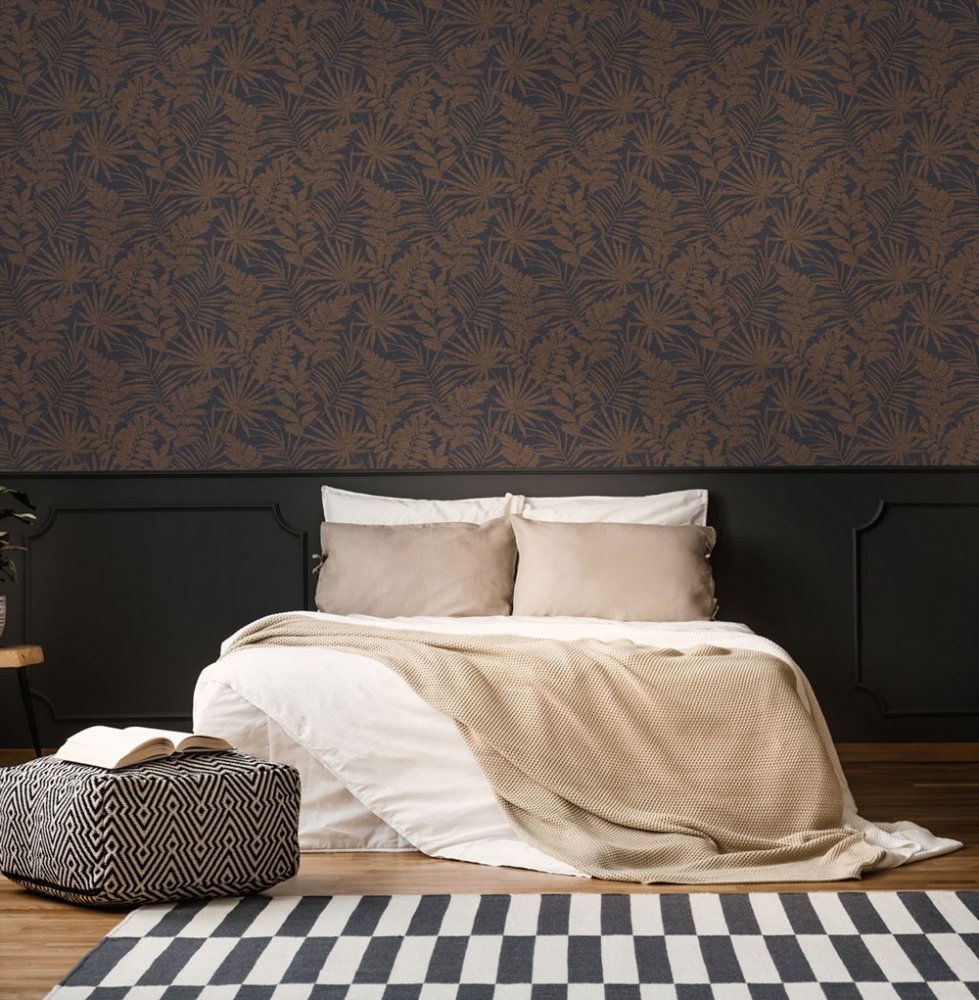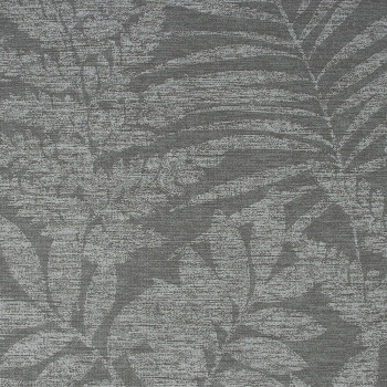 Vliestapete mit Stoffstruktur, Blatt-Dessin braun-schwarz Melange, grau-schwarzer Hintergrund.
