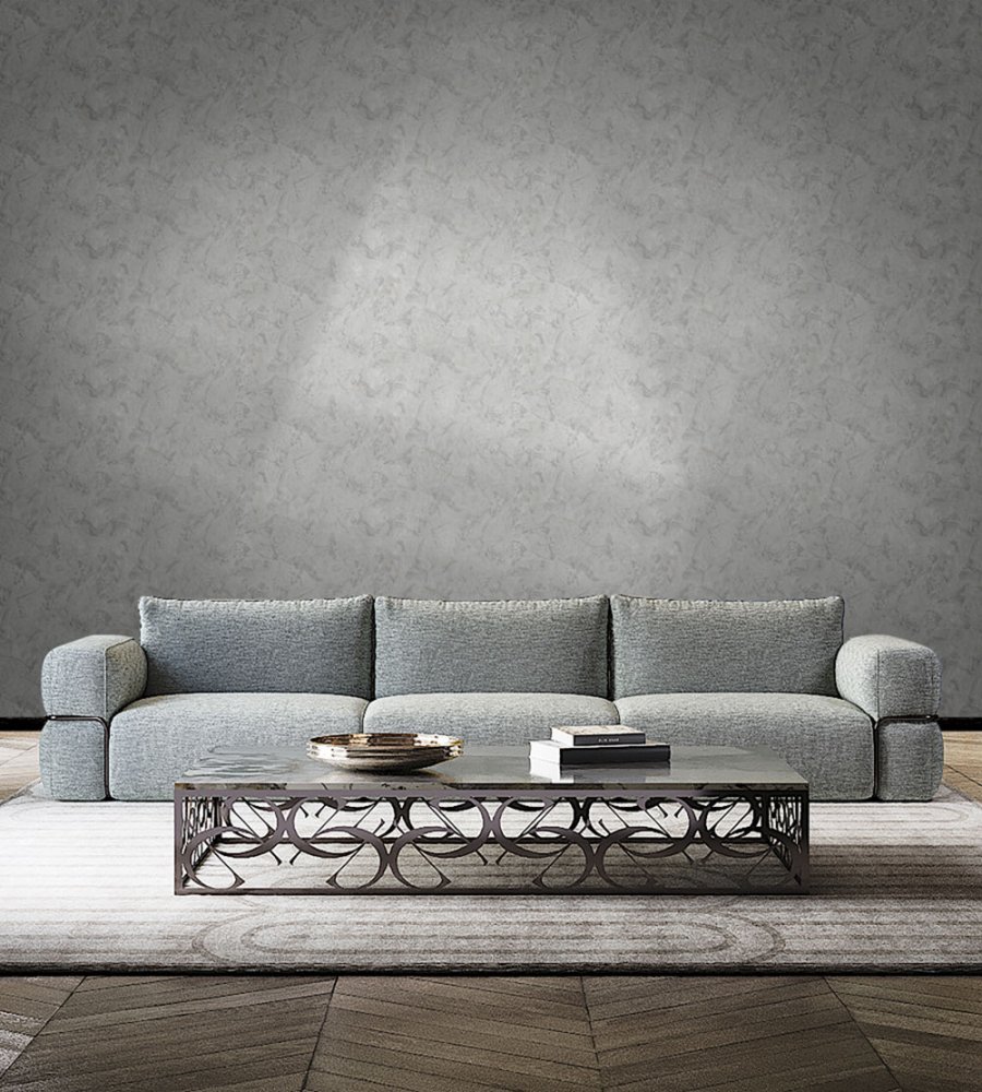 Luxus- Vliestapete mit Vinyloberfläche mit Stuckmuster in Grautönen mit feinem Silber- und Kupferglanz.