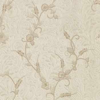 Luxus Vliestapete mit Vinyloberfläche mit einem ungewöhnlichen Muster - geprägte Wellen und Blätter in einem beigen (Sand-)Ton mit einem goldenem Muster von Zweigen mit Blumen und Blättern.