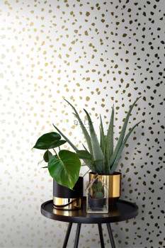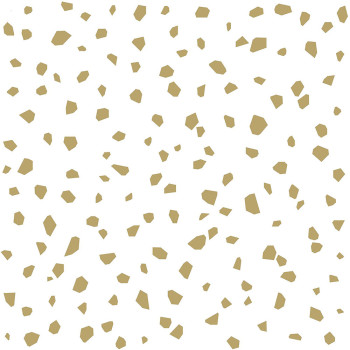 Vliestapete weiß mit goldenen unregelmäßigen Formen.