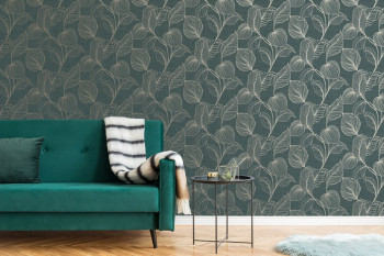 Smaragdgrüne Vliestapete mit dezenten Bronzereflexen. Metallisches Design aus hellgoldenen Blättern.