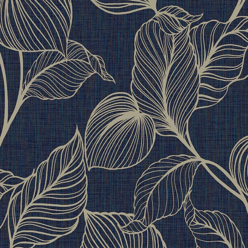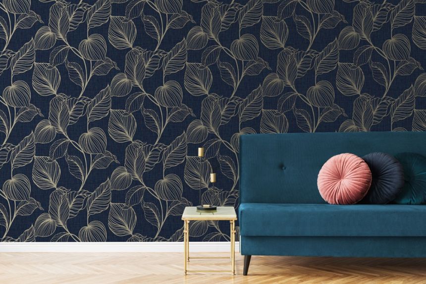 Saphirblaue Vliestapete mit dezenten Bronzereflexen. Metallisches Design aus hellgoldenen Blättern.