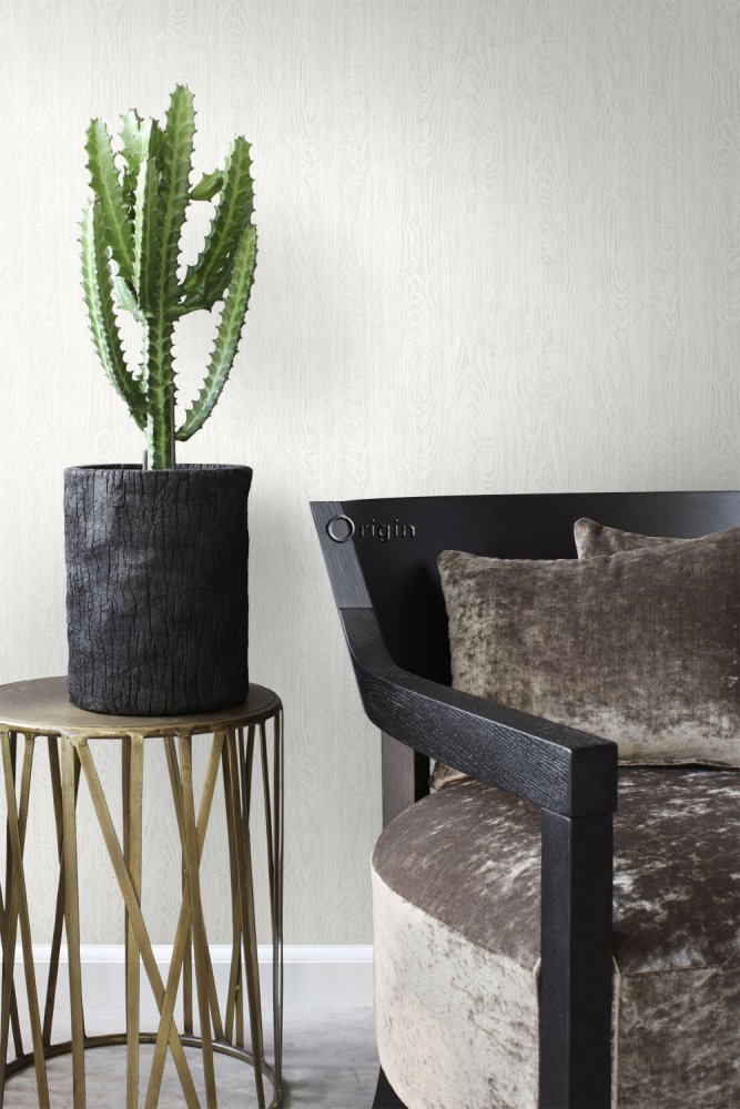 Metallic grau-cremefarbene Vliestapete in feiner Holzstruktur.