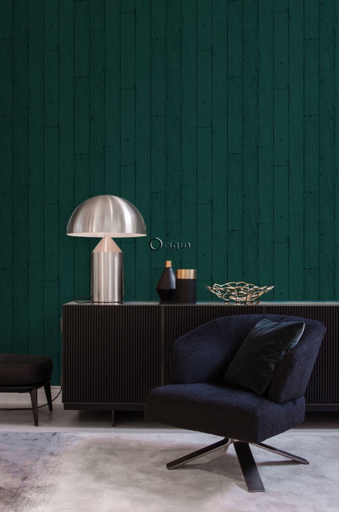 Grün-schwarze Vliestapete für die Wand, Holzbretter-Imitation.