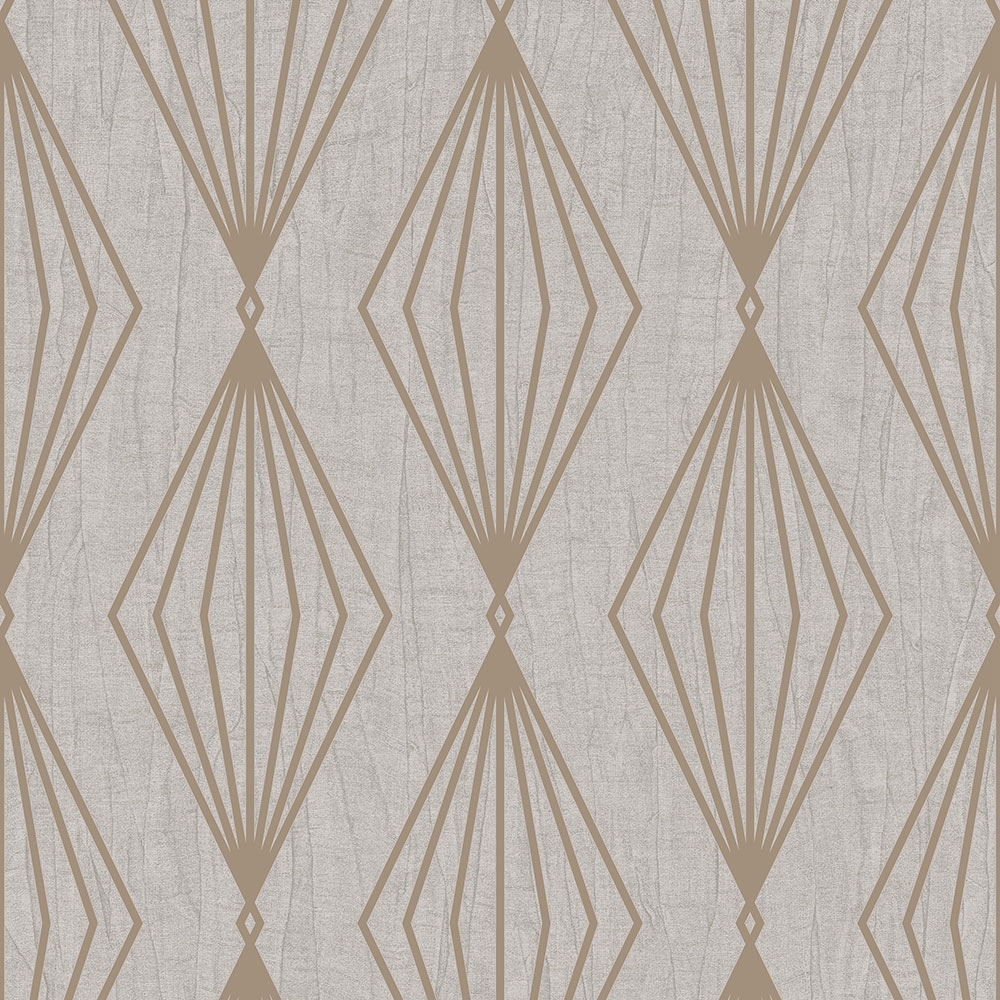 Vliestapete mit Vinyloberfläche. Rautenmuster mit roségoldenen Umrissen mit silbernen Pailletten, rauchgrauer Tapetenhintergrund mit dezenten Bronzereflexen. In Wirklichkeit dunkleres Grau empfehlen wir, ein Muster anzufordern.