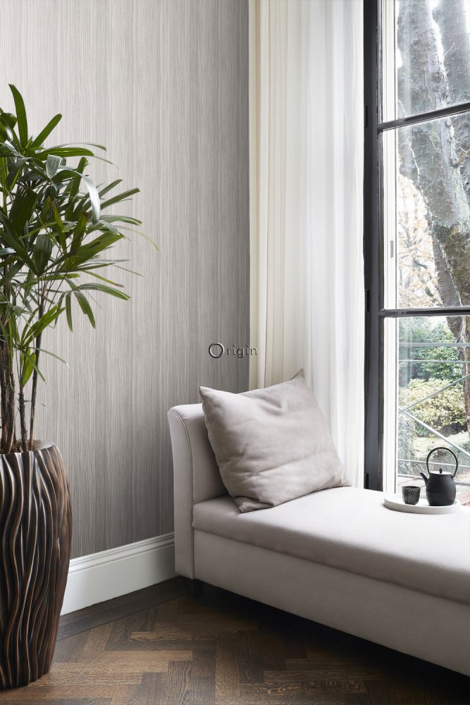 Metallic grau-silberne Vliestapete für die Wand, Holzoptik mit feiner Struktur.