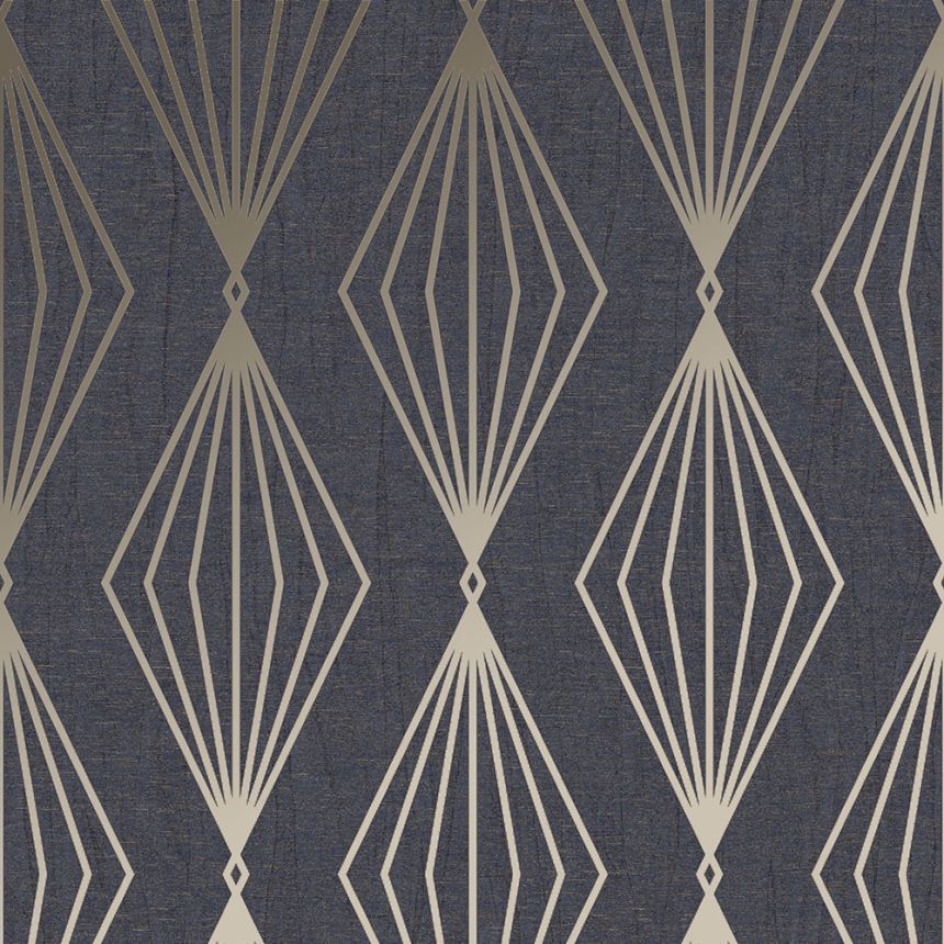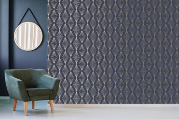 Vliestapete mit Vinyloberfläche. Rautenmuster mit silbernen Pailletten, Saphir / dunkelblauer Tapetenhintergrund mit bronzenen Reflexen.