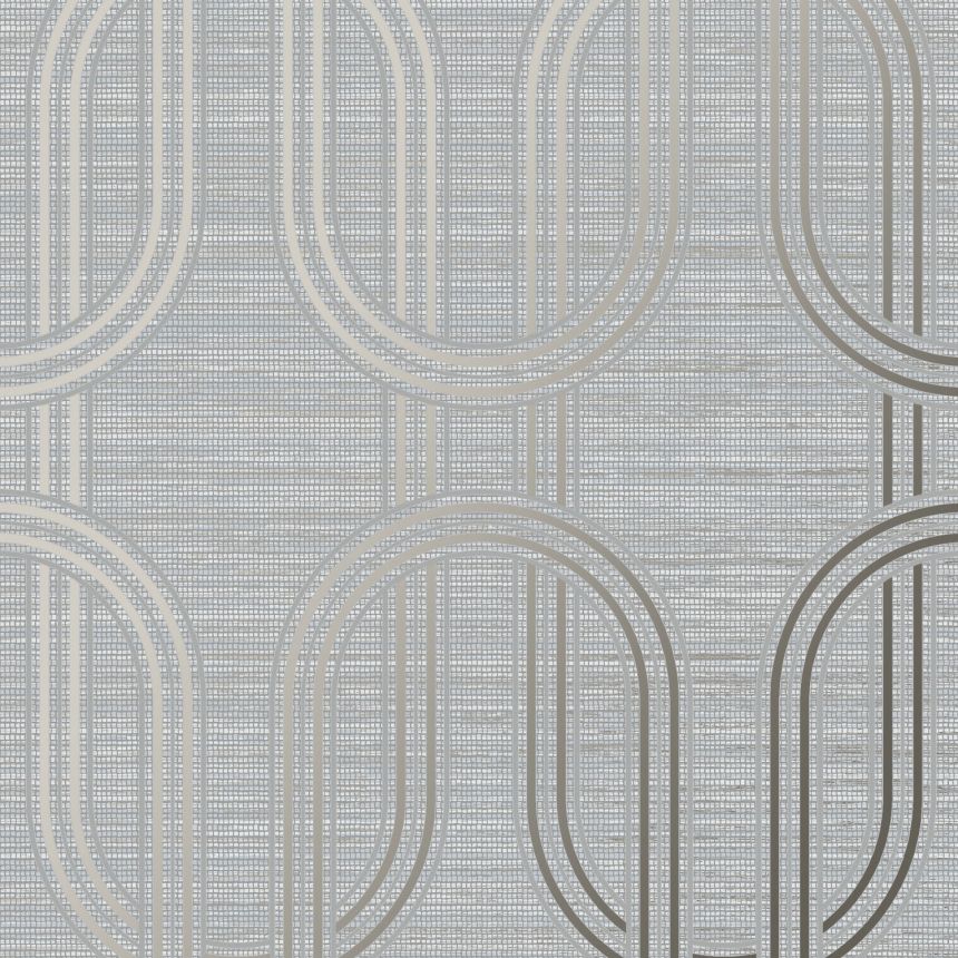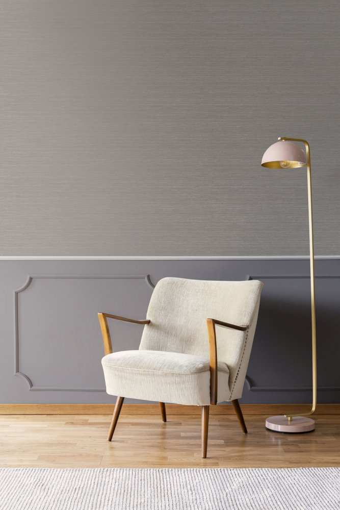 Vliestapete mit Vinyloberfläche - Imitation eines gröberen Stoffes. Die Tapete ist grau mit Metallic-Gold- und Silber-gestromte.