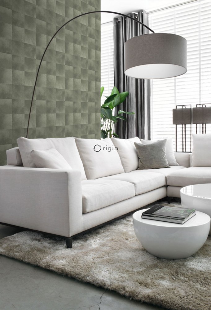 Graue Vliestapete für die Wand, Fellimitat in Quadraten.