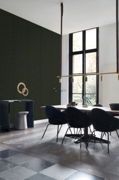Dunkelgrüne Vliestapete, Kunstleder, Parkettmuster.
