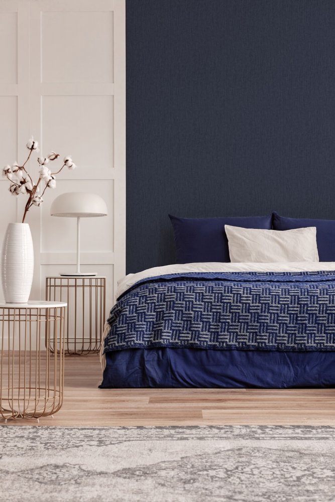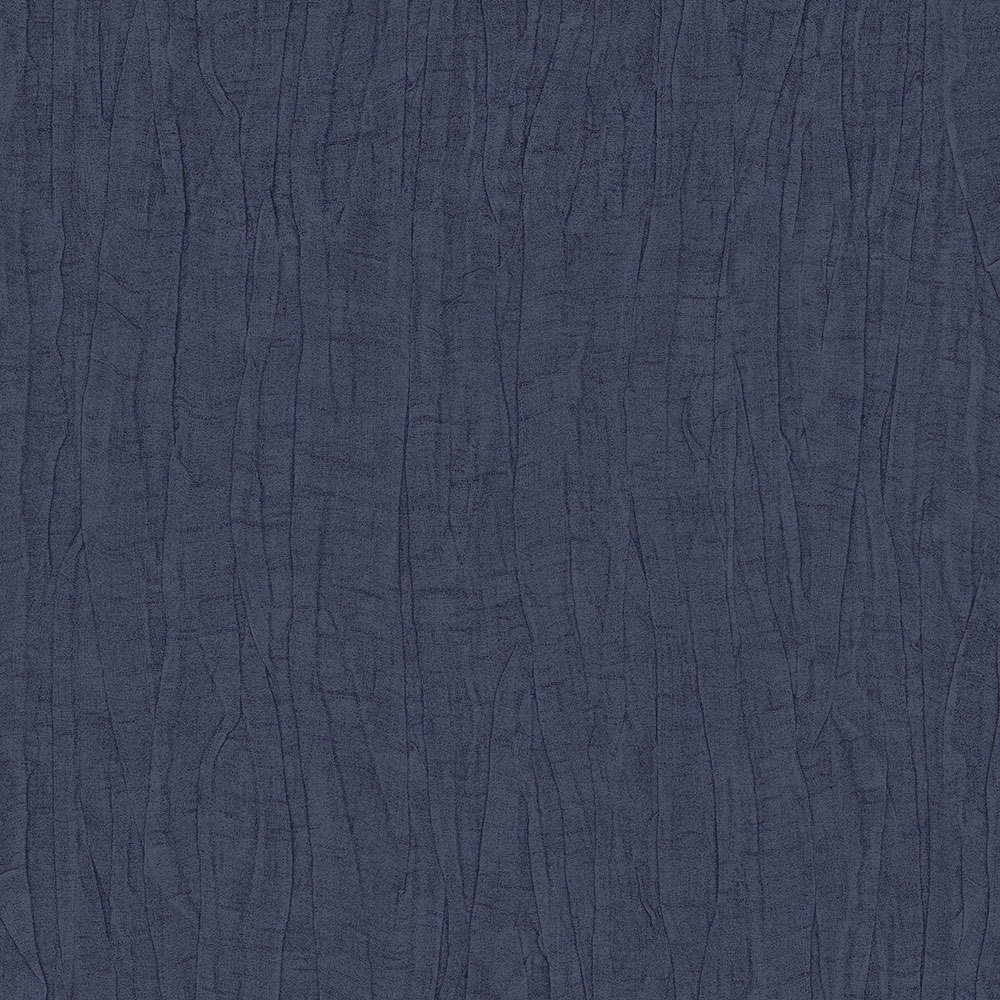 Vliestapete mit Vinyl Oberfläche - Design inspiriert von gepresster Seide. Die Tapete ist saphirblau mit dezenten Bronzereflexen.