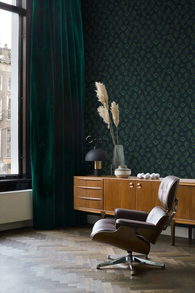 Blaue Vliestapete für die Wand mit Pfauenfedern 347766, Luxury Skins, Origin