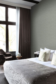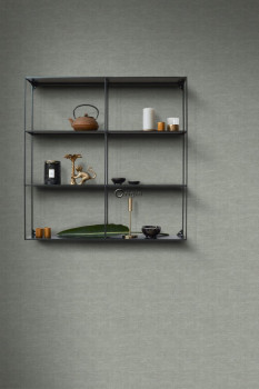 Graugrüne Vliestapete, Stoffimitat, feine Struktur.