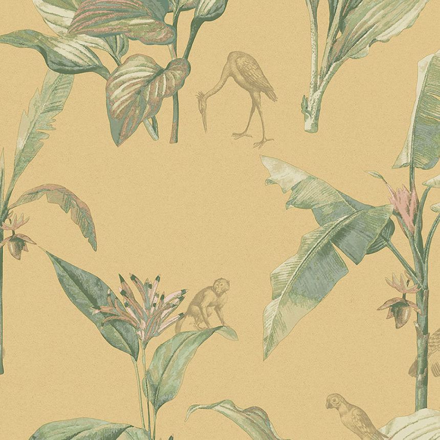 Ocker Vliestapete für die Wand, Palmblätter, Vögel, Affen 317343, Oasis, Eijffinger
