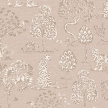 Fein strukturierte rosa Vliestapete, Motiv von Bäumen, Tigern und Leoparden.