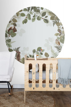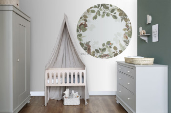 Selbstklebende kreisförmige Tapete, Motiv Wald und Waldtiere.