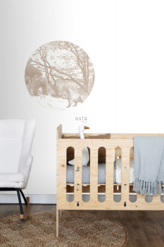 Selbstklebende kreisförmige Tapete, braune Zeichnung des Waldes, Waldtiere - Bären, Füchse, Dachs, Rehe.