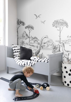 Schwarz-weiße Wandbilder mit Dinosauriern. Die Tapete hat ein durchgehendes Muster, für eine größere Breite einfach ein weiteres Stück kaufen.