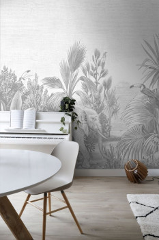 Wandbilder, graue Zeichnung des Dschungels, Elefanten, Palmen.