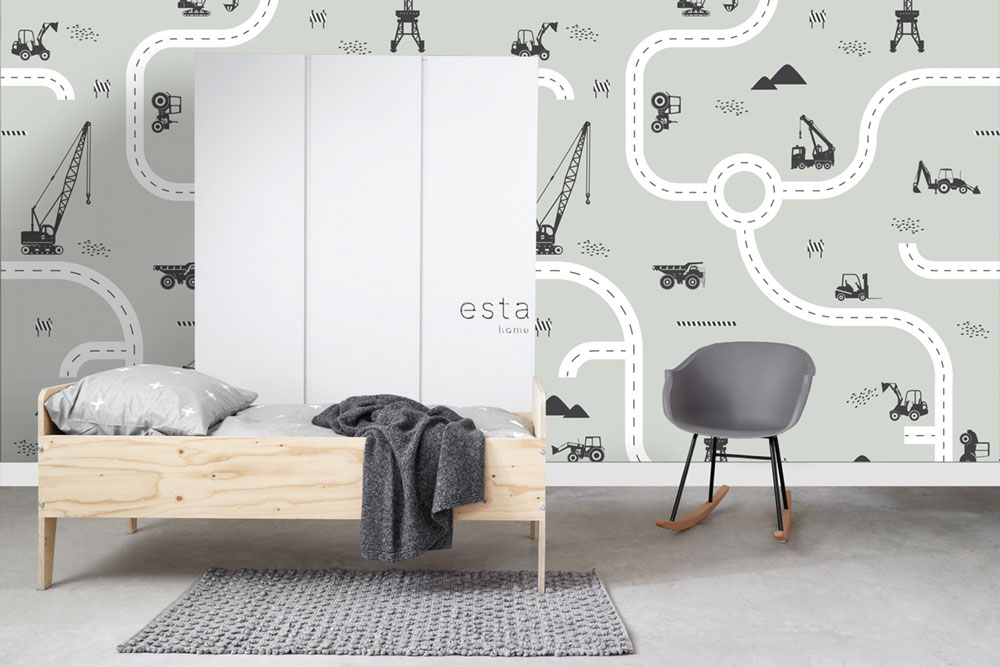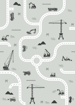 Wandbilder für Jungen, Motiv von Straßen, Traktoren, Kränen und Lastwagen. Die Tapete hat ein durchgehendes Muster, für eine größere Breite einfach ein weiteres Stück kaufen.