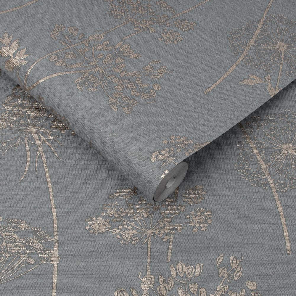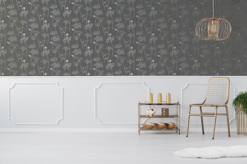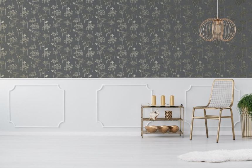 Vliestapete mit goldenem Pflanzenmotiv. Textilstruktur Hintergrund in dunkelgrauer Farbe mit goldenen Reflexen.